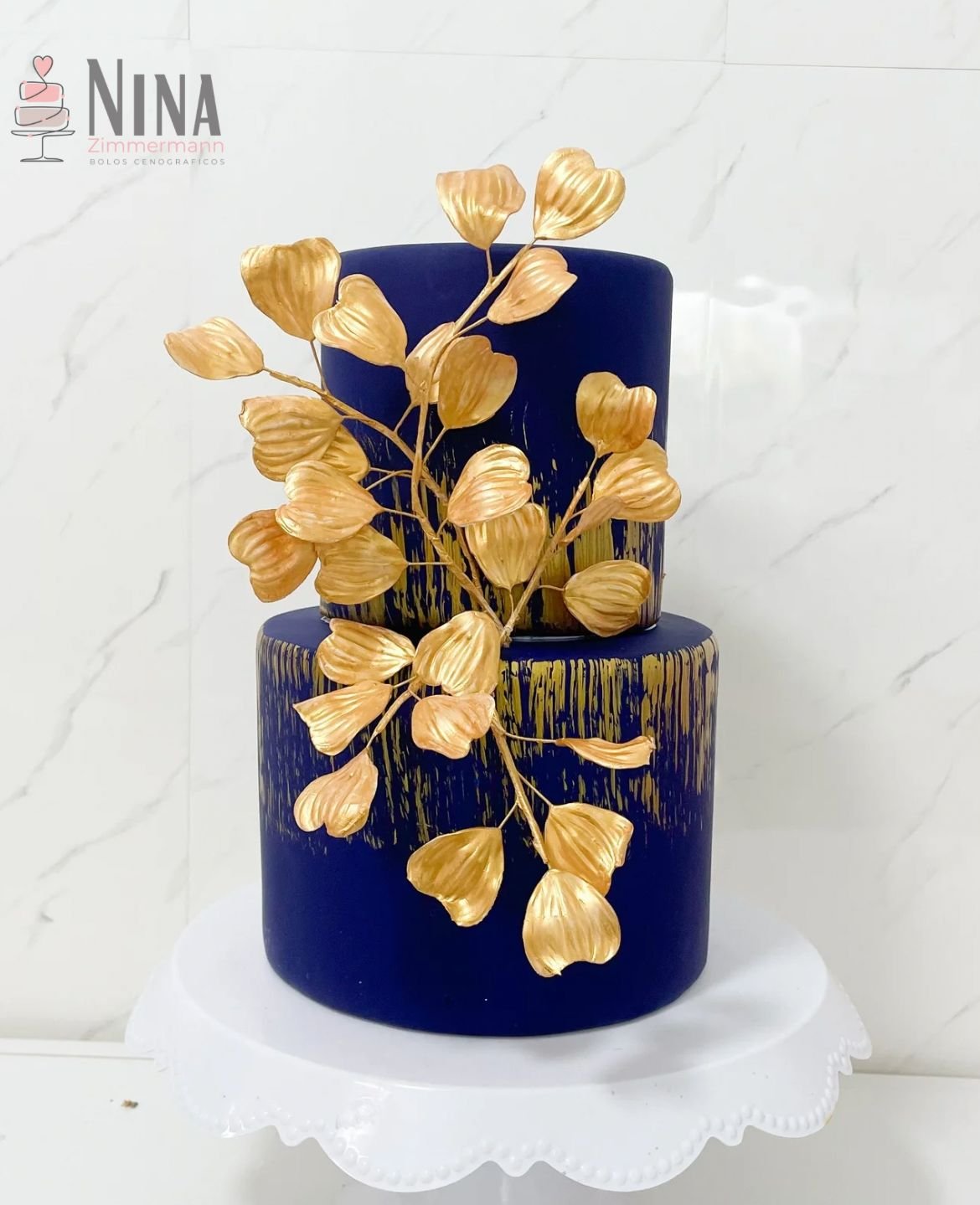 Bolo fake azul com flores douradas. Lindo para aniversários de adultos.