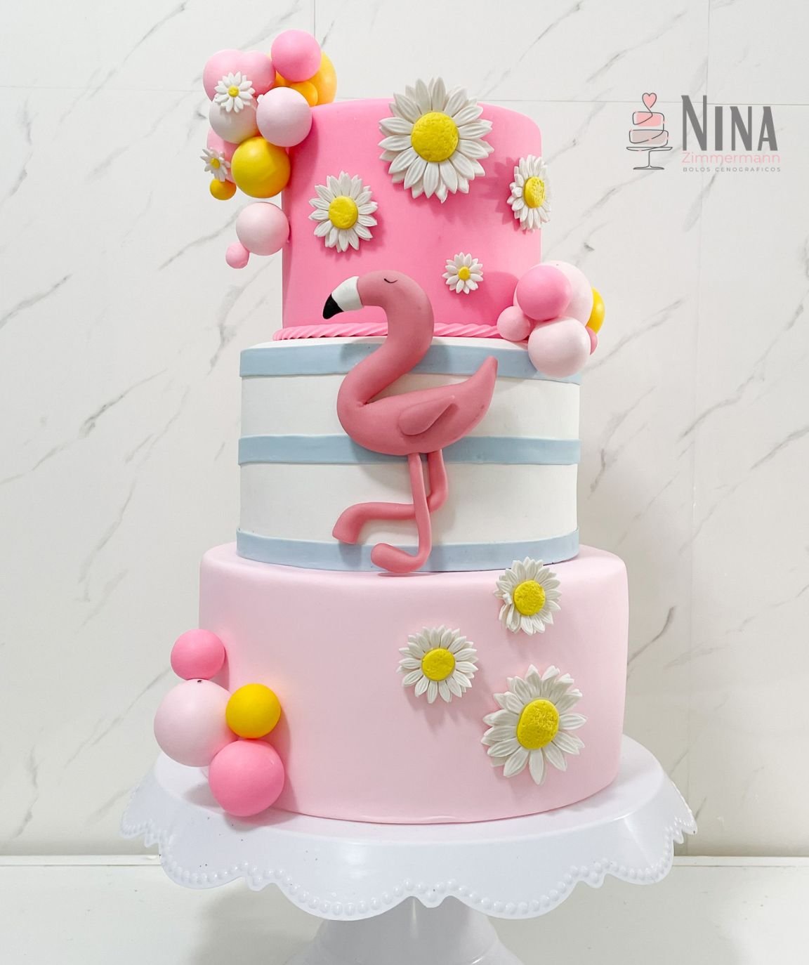 Bolo cenográfico tema Flamingo. Tons rosas.