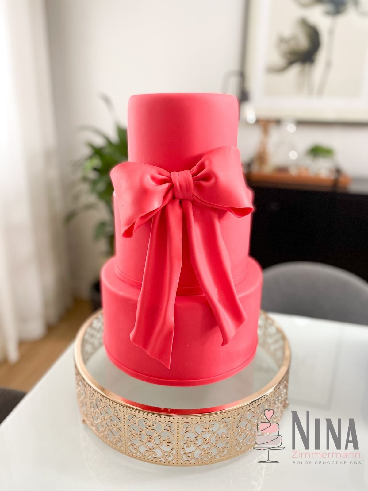 Lindíssimo bolo rosa com um laço. Especial para festas de meninas mulheres que querem mais elegância em sua decoração.